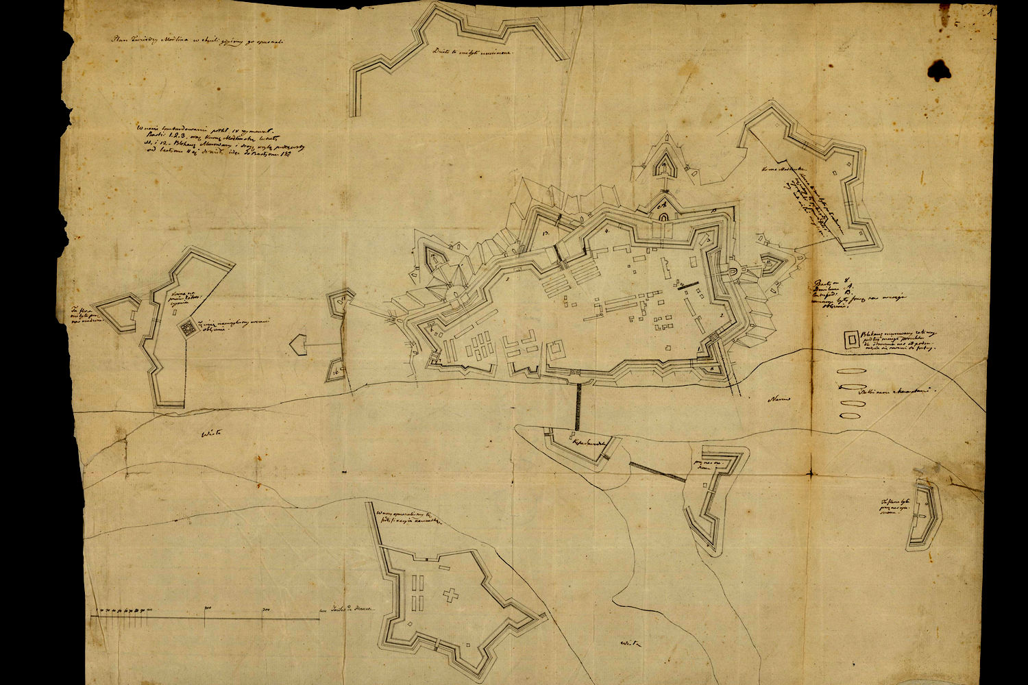 fot.5. Plan Twierdzy Modlin, prawdopodobnie w roku 1831, z dopiskami obrońców twierdzy z Powstania Listopadowego.