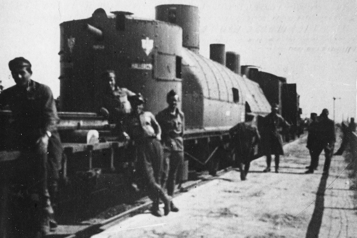 Polskie wojska w czasie walk 1920 roku, jeńcy rosyjscy, pociąg pancerny "Hallerczyk". Na pierwszym zdjęciu fort XIV w Goławicach.