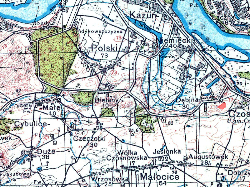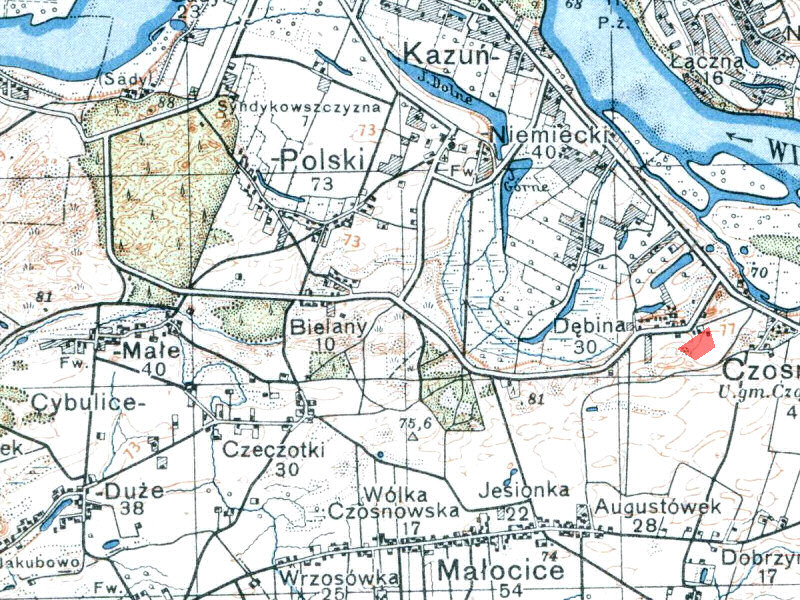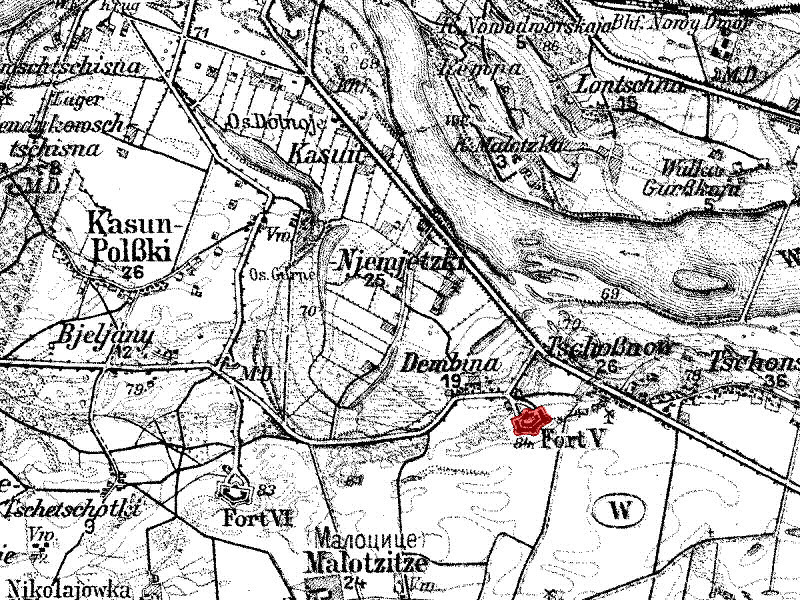 Fort V na starych mapach fot.1 "Karte des Westlichen Russlands" jest to niemiecka mapa z 1915 roku w skali 1:100 000, oparta na mapach rosyjskich dwuwiorstówkach (Nowaja Topograficzeskaja Karta Zapadnoj Rossji) w skali 1:84 000. Mapy te opracowane były dla terenów byłego zaboru rosyjskiego. Mapy tylko w formie czarno-białej. fot.2 Mapy WIG (Wojskowy Instytut Geograficzny) zostały opracowane w latach 1919-1939. Wydane w latach 30-tych XX wieku mapy są uważane za jedne z najlepszych na świecie. Powstały w skali od 1:100 000, w formie kolorowej (4 kolory). Były także częściowo wydawane mapy w skalach od 1:25 000 do 1:300 000. fot.3,4 Niemieckie mapy z okresu II Wojny Światowej są w całości oparte na polskich mapach WIG. Wydana została zarówno mapa w skali 1:100 000 (kolorowa) jak i 1:25 000 (czarno-biała).
