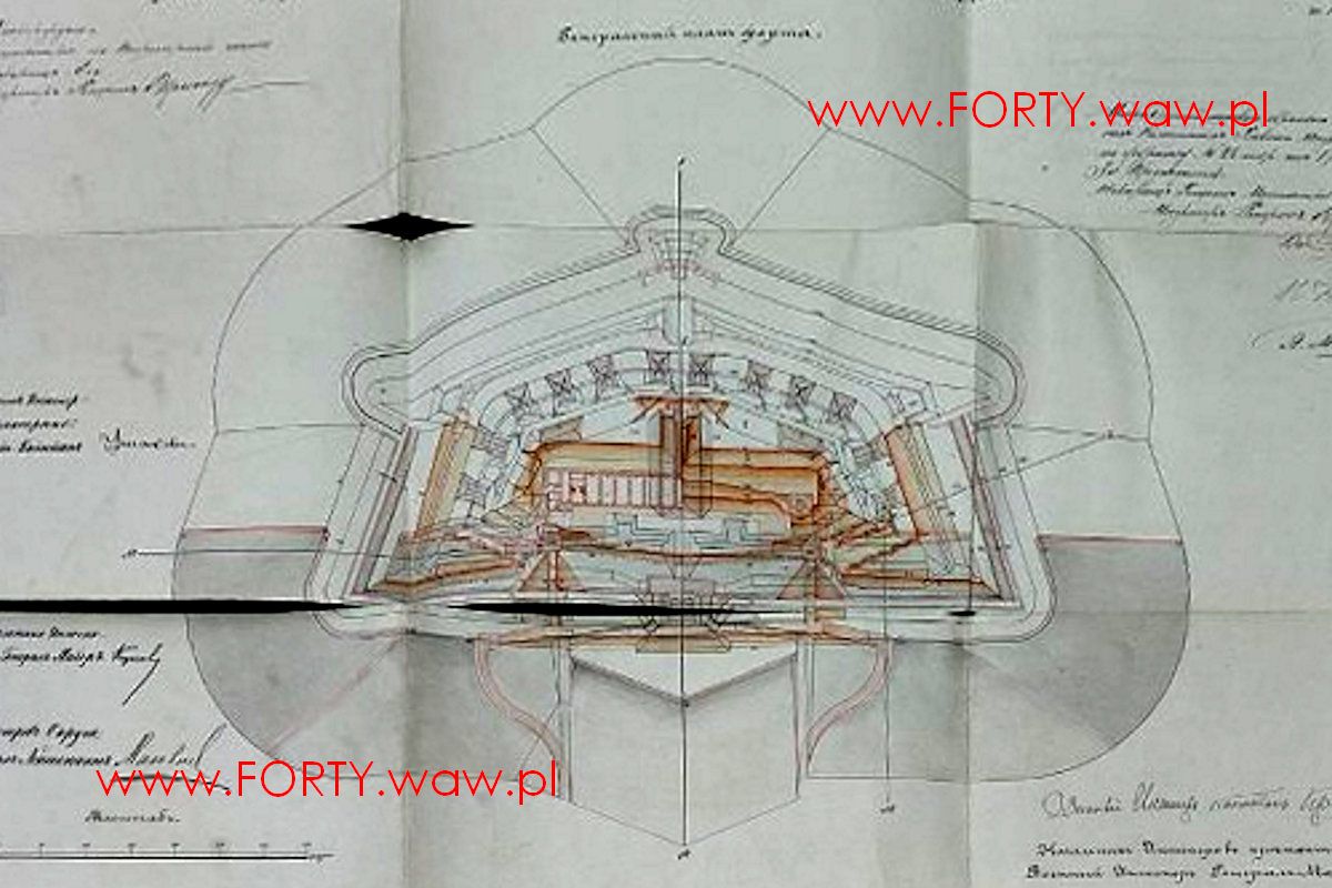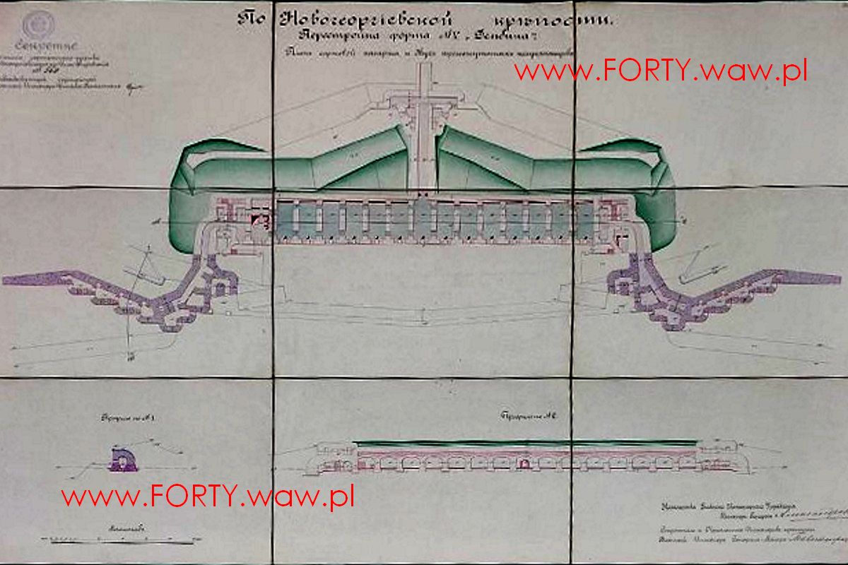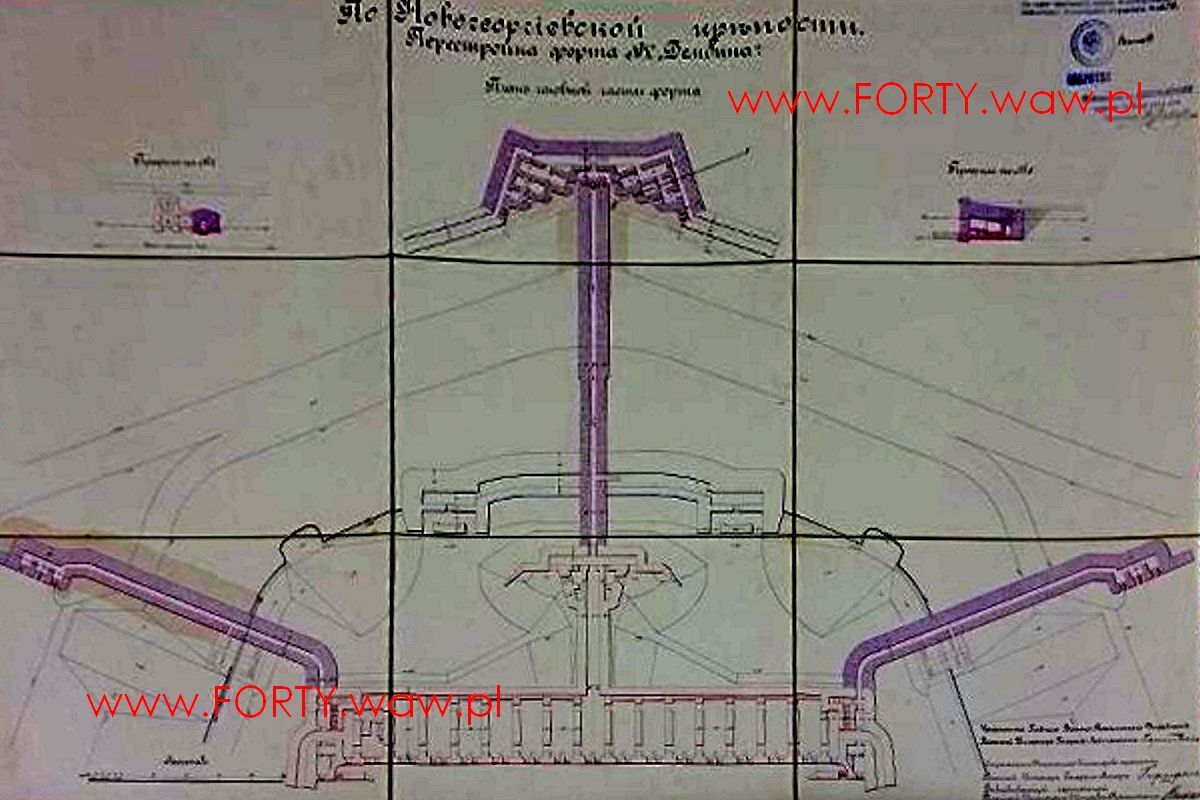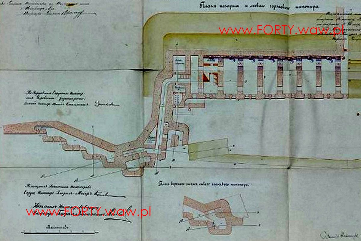 Fort V Dębina, oryginalne plany przebudowy z lat 1910-1914, źródło: Katalog Państwowy Funduszu Muzealnego Rosji. fot.1-2. Plany całego fortu z zaznaczeniem koszar, widać jeszcze pierwotną kaponierę czołową i szyjową.