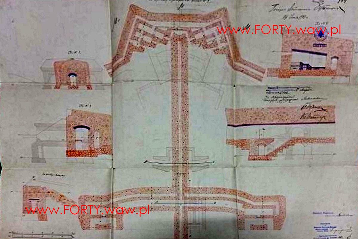 fot.6. Plany całego fortu z zaznaczeniem kaponiery przeciwskarpowej, koszary już po przebudowie. fot.7-8. Plany przebudowanych kaponier.